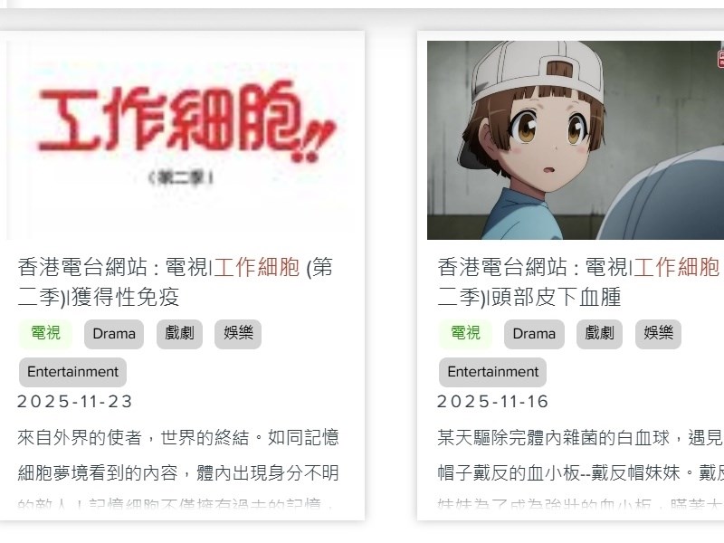 - 中日關係緊張之際 香港官方電台停播日本動畫「工作細胞」2025/11/20 09:50
