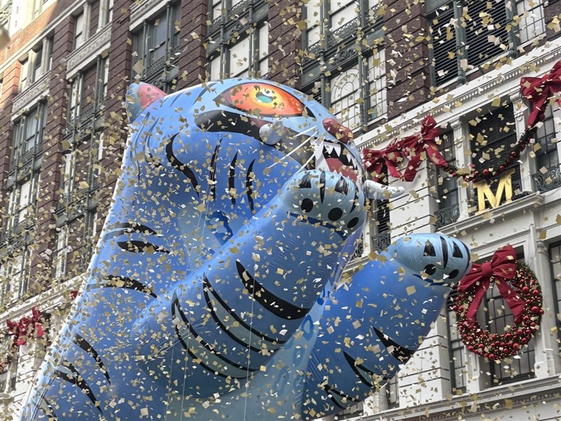 (中央社紐約27日綜合外電報導)美國紐約梅西百貨感恩節遊行今天登場,有巴斯光年(Buzz Lightyear)、Pac-Man小精靈和Kpop獵魔女團動畫中可愛老虎的巨型氣球飄在空中,還有Labubu和樂高(Lego)主題的花車穿梭街頭。