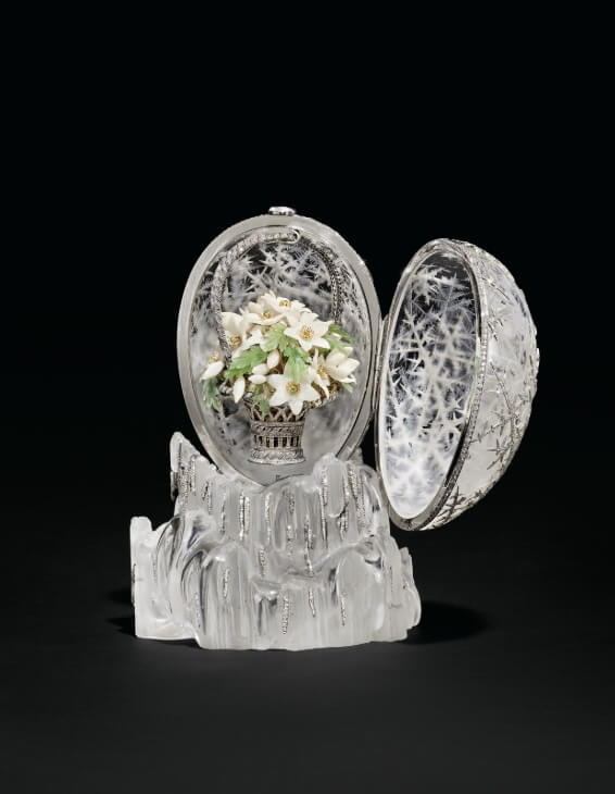 「冬之蛋」以纖細的水晶雕琢而成,外觀清冷如冰,鑲嵌約4500顆玫瑰式切割鑽石,高僅14公分。