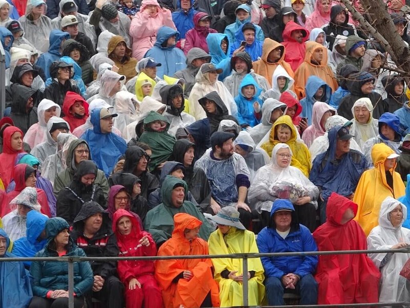 清晨大雨中,9公里的遊行路線坐滿觀眾,人人備妥雨具。主辦單位日前宣布,售票的看台禁止撐傘,以免遮檔視線,今天現場呈現一片色彩繽紛的「雨衣海」。