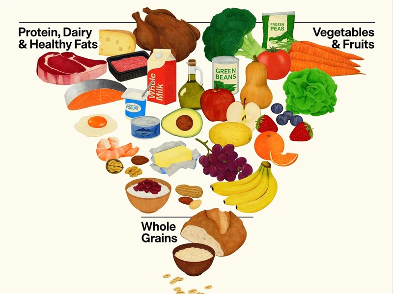 法新社報導,最新聯邦營養指南比以往更強調蛋白質,並發布了一張飲食金字塔圖示,優先順序被重新排列,將肉類、乳製品與健康脂肪與蔬菜、水果並列在同一層,而富含纖維的全穀類(如燕麥)則被放在最底端。