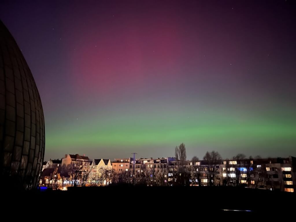 中央社記者在柏林市中心肉眼觀察,受到光害影響,天空所見僅為淡色光暈,但透過手機夜間拍攝模式,能看見夜空呈現和日常不同的紅、綠、深紫等色彩。