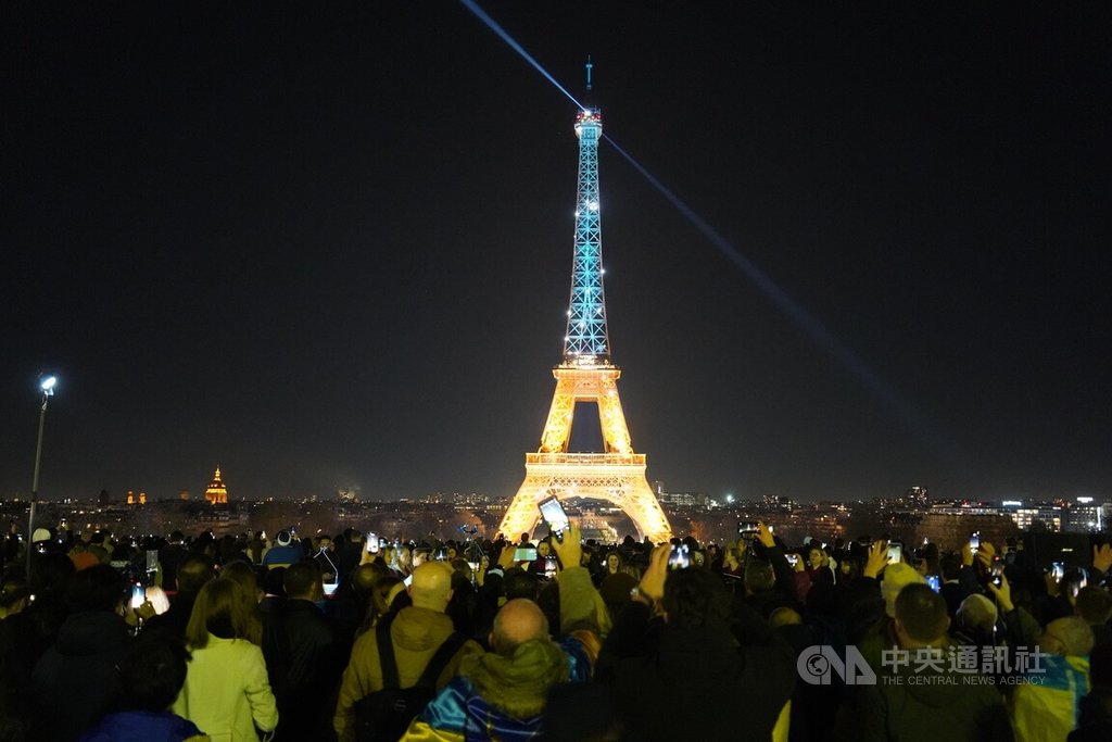 (中央社記者曾依璇巴黎24日專電)俄羅斯2022年2月24日全面入侵烏克蘭,迄今滿4年,巴黎艾菲爾鐵塔點亮代表烏克蘭國旗的藍、黃色燈光以示支持,烏克蘭人祈願戰火平息好讓他們返國,也有許多法國人聲援。