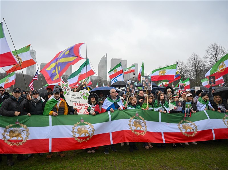 在柏林,伊朗大使館前的集會同時譴責政府與國王之子,呼籲「既不要君主制,也不要教士獨裁」,而是「民主與平等」。(編譯:鄭詩韻)1150301