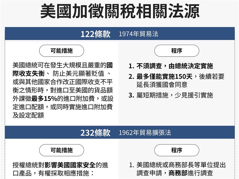 國會2月報告指出,川普是第一位援引第「122條」徵收關稅的美國總統;依照「122條」開徵的關稅只能維持150天,除非國會通過延長。