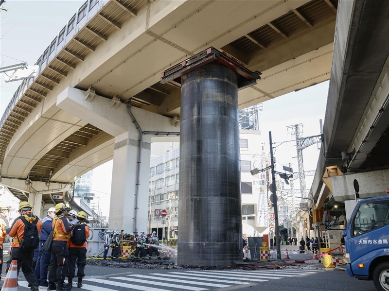 (中央社大阪11日綜合外電報導)日本大阪市北區茶屋町的鬧區街頭,今天上午有行人報警稱「工地有混凝土掉落」,警方獲報後說明,是直徑約5公尺的地下管線衝破柏油路面,且凸出路面的管線高達10幾公尺。