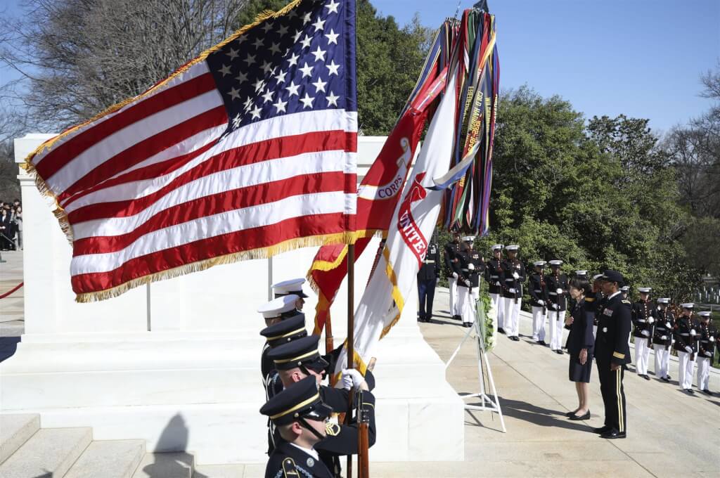 公墓現場今天奏起日本與美國的國歌,高市隨後在紀念身分不明陣亡將士的無名戰士塚(Tomb of the Unknown Soldier)前獻上花圈。