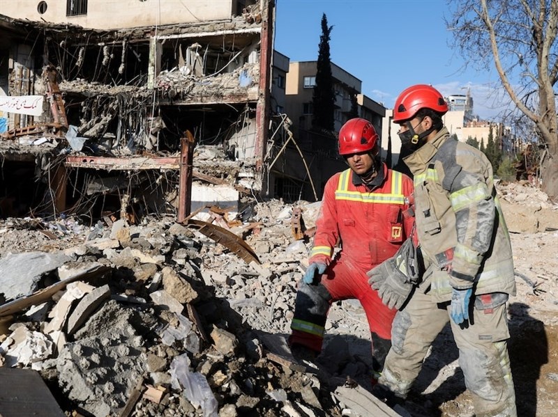 紅新月會救援隊成員21日在伊朗首都德黑蘭一棟被攻擊損壞的建築物內工作。(路透社)