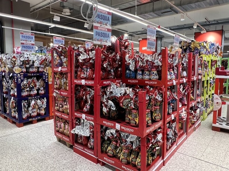 走進義大利大型超市,上百顆巧克力蛋堆成小山十分壯觀。一般送給兒童的平價巧克力蛋價格約為10到15歐元(約370至550台幣),彩蛋封面會標示內含哪類驚喜禮品,選擇十分「國際化」,有日系Hello Kitty彩蛋,韓系「魷魚遊戲」彩蛋,航海王(ONE PIECE)、以及寶可夢、蜘蛛人、美國隊長等動漫角色應有盡有。