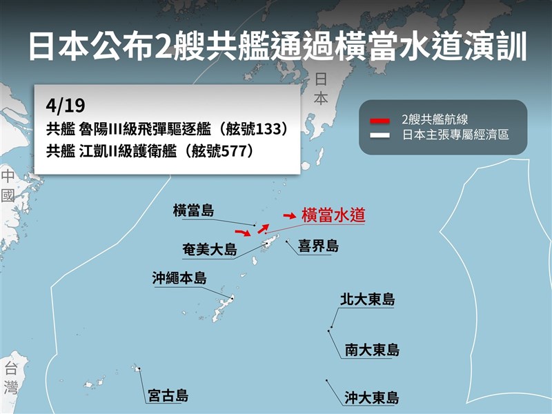 (中央社記者戴雅真東京20日專電)日本防衛省今天表示,海上自衛隊於19日上午11時左右,在鹿兒島縣橫當島西南約60公里海域,確認到正在向東航行的中國海軍艦艇。