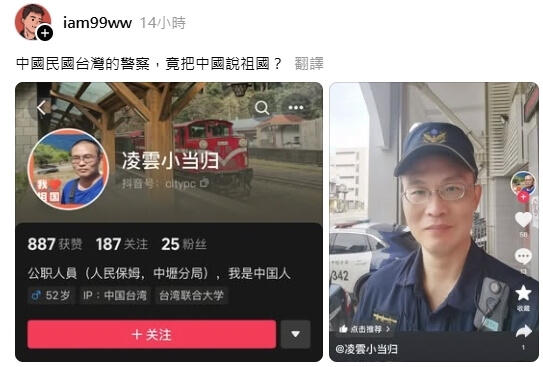 中壢分局晚間發布新聞稿表示,中壢分局警備隊葉姓員警日前於社群平台註冊一案,經初步了解,是於110年至113年間,在勤餘時間發表包含有「我愛祖國」(簡體字)的合成自拍照片等3篇文章,但目前帳號已經關閉。