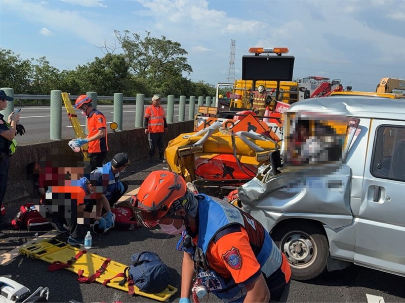 台南市政府消防局下午3時19分獲報,指稱國道3號北向337.5公里處善化路段有廂型車撞及公務車防撞車事故,多人受困,立即調派13部各式車輛、24名人員前往,抵達現場發現8人受困於車體變形的廂型車,隨即展開破壞車體搶救傷患,陸續協助8人脫困。
