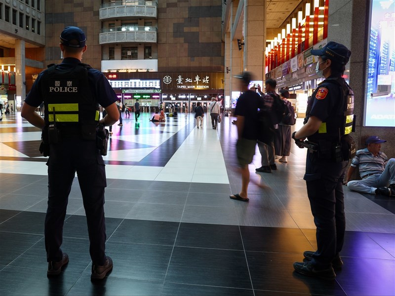 圖為2名員警在北車大廳加強巡邏。(中央社檔案照片)