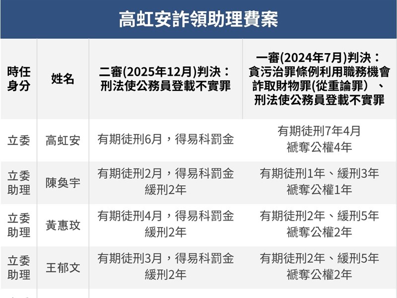 全案起於,高虹安被控擔任立法委員期間,浮報助理酬金及加班費,一審認定高虹安與3名助理(陳奐宇、黃惠玟、王郁文)罪證明確,構成貪污治罪條例利用職務機會詐取財物罪、使公務員登載不實罪,從重依貪污罪判高虹安7年4月徒刑、3名助理有罪獲緩刑;全案經上訴,二審由台灣高等法院審理,今天認定不構成貪污罪,僅依使公務員登載不實偽造文書罪論罪。
