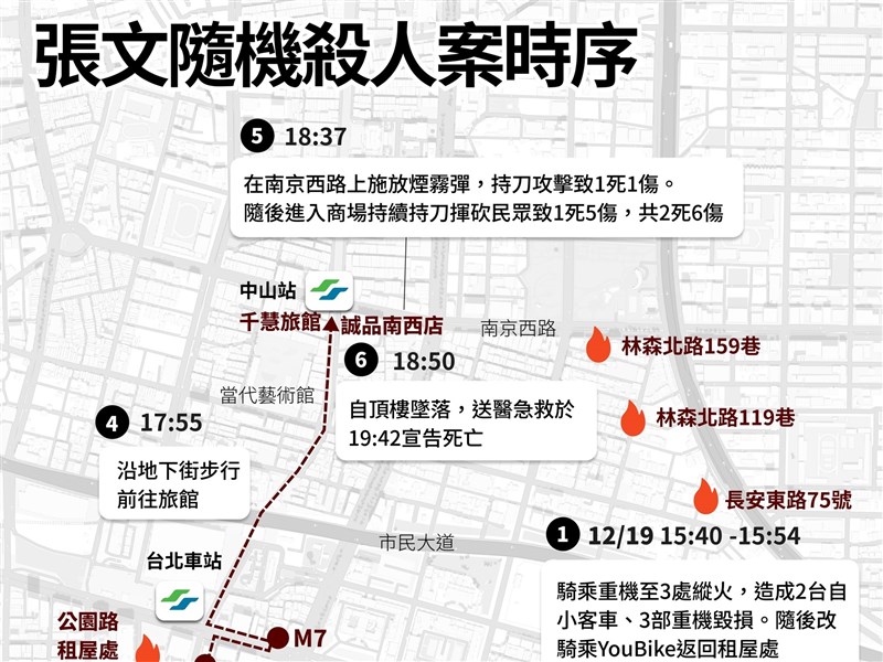張文在昨天下午5時許步行到北車M7、M8地下通道的交接處丟擲煙霧彈,之後走連通道返回旅社,再度拿取刀械、煙霧彈至南京西路、捷運中山站外犯案後闖入百貨公司,期間持刀砍傷多人,37歲蕭姓男子及王姓男子傷重不治身亡。