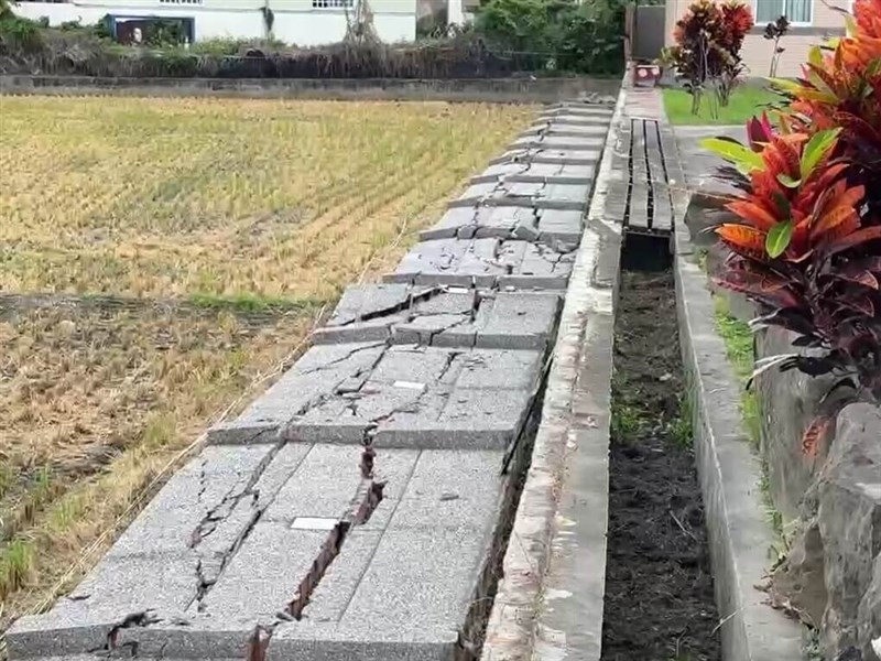 今天上午台東市有農民巡視田間,發現農田旁的長50公尺水泥磚牆倒塌,他檢視監視器畫面,地震當下,圍牆左右晃了幾次後倒下,還好稻子已經收割了。