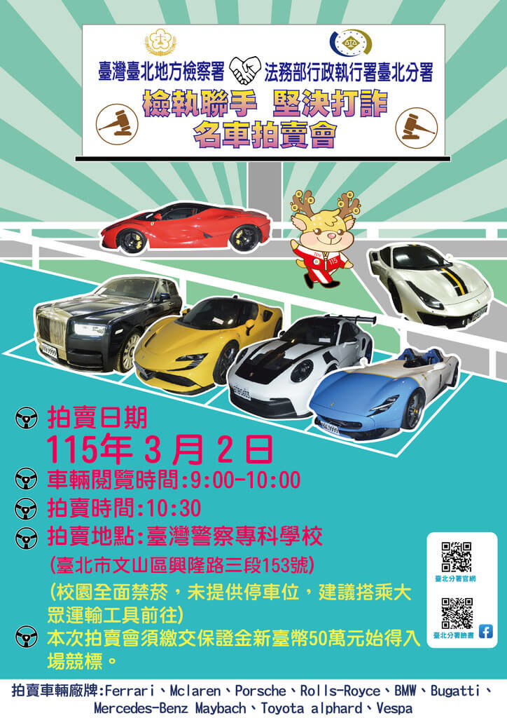 (中央社記者林長順台北9日電)行政執行署台北分署今天表示,受北檢囑託將於3月2日在警專舉行「聯合打詐宣示儀式暨名車拍賣會」,標的物包括太子集團案查扣的33輛名車,包括備受全球收藏家矚目的「四大神獸」等頂級超跑。