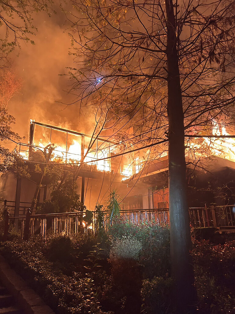 (中央社記者鄭維真彰化2日電)彰化縣花壇鄉供奉關聖帝君的玄門山,昨晚1棟3層樓木造建築全面燃燒,消防人員馳援灌救,今天凌晨撲滅火勢,幸無人傷亡,確切起火原因待調查。