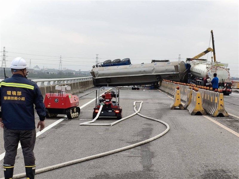 消防局表示,根據現場翻覆化學槽車司機所述,車內物質疑為乙酸甲酯並有洩漏狀況,另一輛化學槽車無洩漏;事發現場北側由台中市消防人員進行安全防護,南側由伸港分隊人車及和美分隊出動消防機器人射水及安全防護。