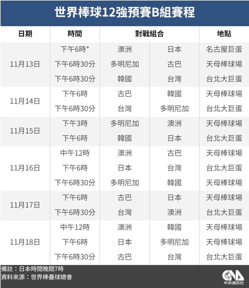 - 世界棒球12強預賽賽程出爐 台灣全在大巨蛋出賽首戰11/13對韓國2024/05/29 09:47