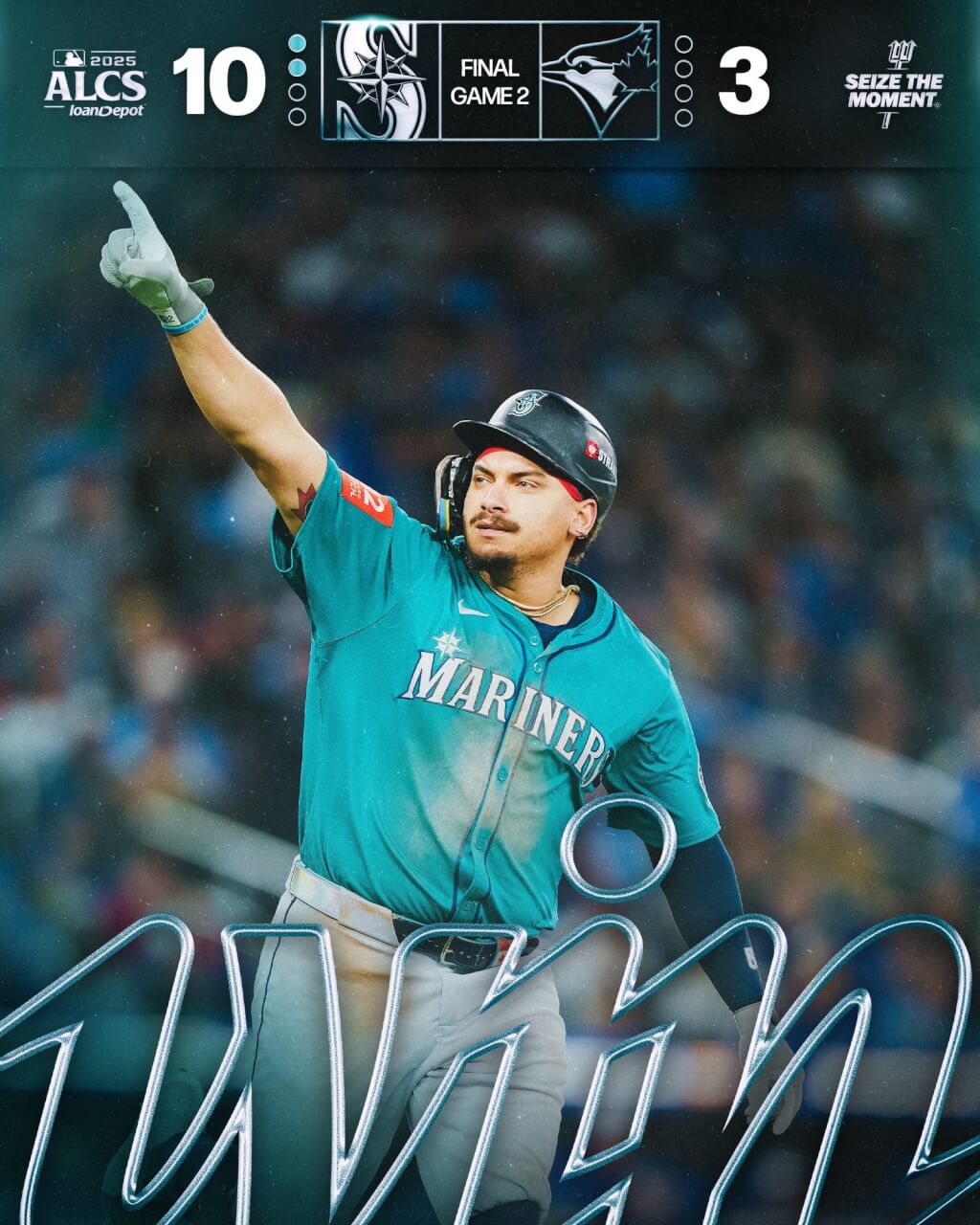 (中央社多倫多13日綜合外電報導)西雅圖水手今天在羅德里格斯、波蘭科各轟一支3分砲,外加內勒的雙響砲加持下,終場以10比3擊敗多倫多藍鳥,在美國職棒大聯盟MLB美聯冠軍系列賽取得2勝0敗優勢。