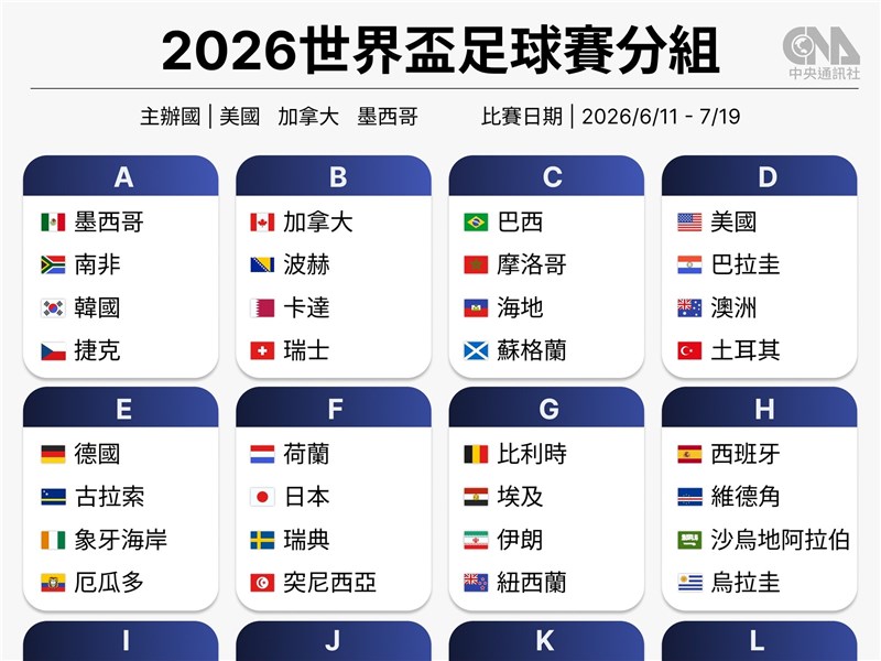 2026世界盃抽籤分組一覽 史上規模最大世足48隊參戰