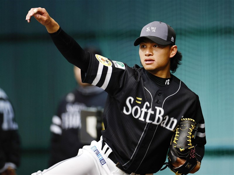 圖為福岡軟銀鷹隊投手徐若熙2日練投畫面。(共同社)