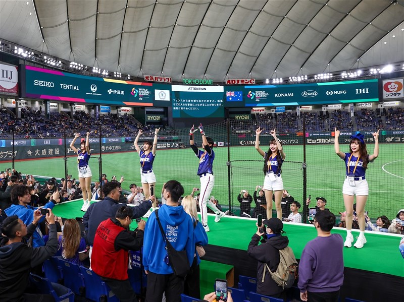 世界棒球經典賽(WBC)C組預賽5日在日本東京巨蛋開打。圖為台灣啦啦隊與球迷練習加油應援口號。中央社記者王騰毅東京攝 115年3月5日