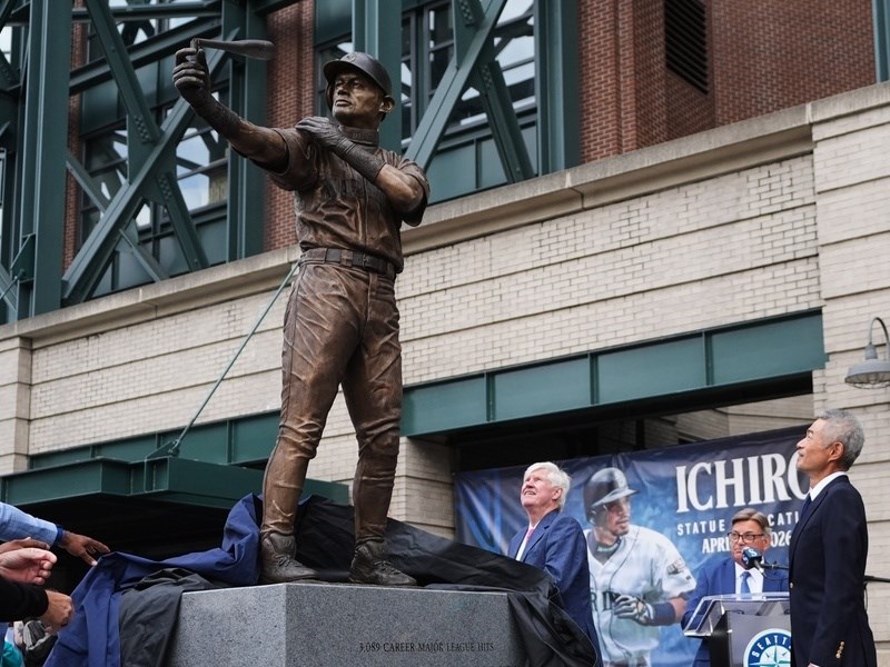 鈴木一朗去年夏天入選美國棒球名人堂,同時也是水手隊史第3位退休背號的球員,與小葛瑞菲(Ken Griffey Jr.)與馬丁尼茲(Edgar Martinez)並列,兩人今天也共同出席銅像揭幕儀式。