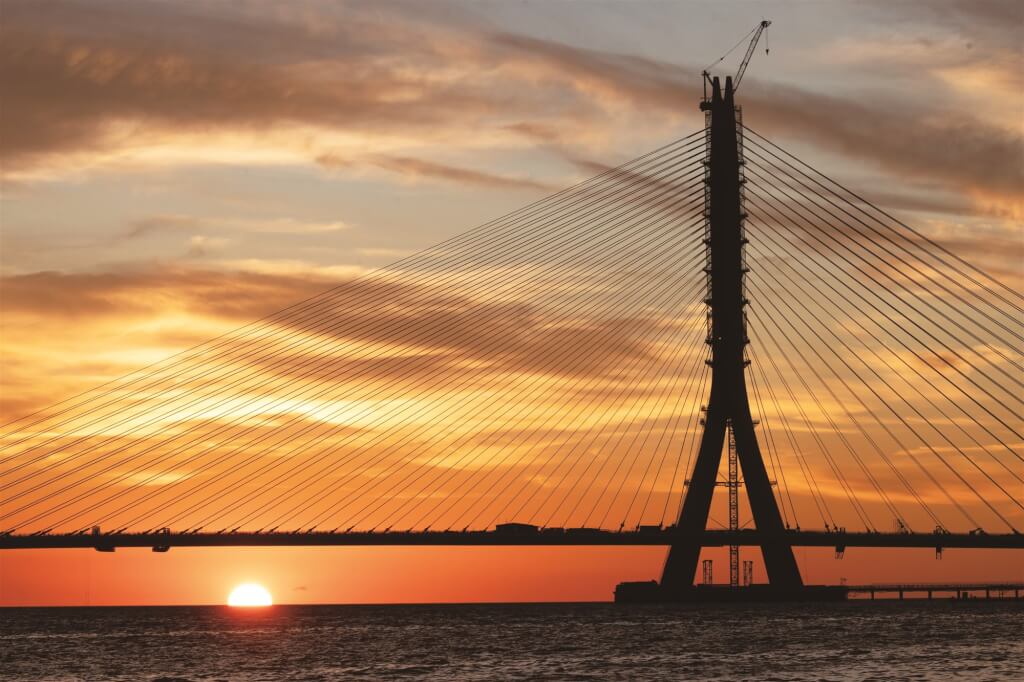 淡江大橋運用「低塔設計」,兼顧視覺通透感與整體景觀協調,保留了淡水河口天際線的開闊感。橋體以簡潔流暢的線條劃過河海交界,與水域及天空形成恰到好處的比例,在晨曦、霧氣或金黃餘暉下,展現出截然不同的光影質感。它不僅是一項交通建設,更像是一件巨型的景觀藝術品。