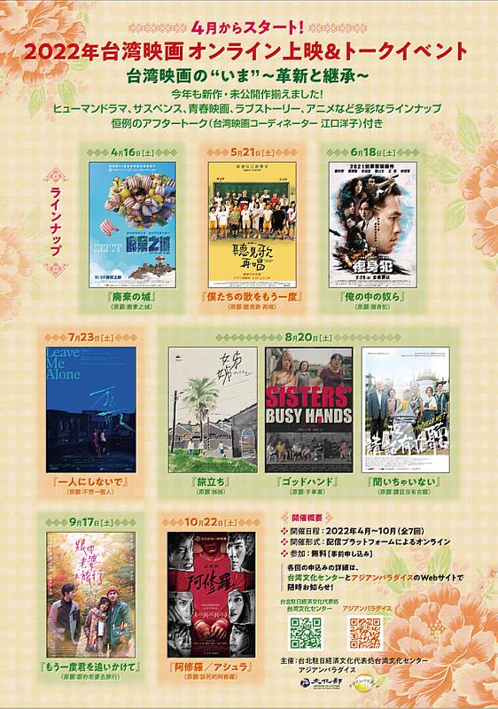 臺灣文化中心表示,臺灣電影上映會是直接向日本民眾推介臺灣新電影的重要管道與活動,開辦至今已成為凝聚日本臺灣電影迷的場域,也累積許多愛臺灣的電影迷,許多日本電影代理商也藉此活動引進及代理臺灣影片,近年來已促成多部作品在日上映。過去皆在文化中心實體放映,約百人規模方式辦理;因疫情影響,為避免群聚感染,自前年起改以線上進行,且擴大報名額度達以往的三倍,大大增加提供全日本民眾在線上即可欣賞臺灣電影的機會。