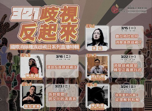 《321‧歧視反起來!國際消除種族歧視日系列直播特輯》完整直播場次名單如下: