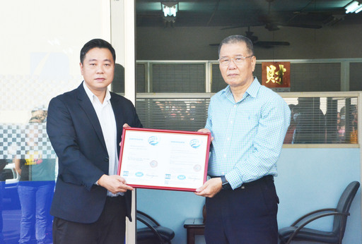 - ARES 國際驗證公司(左),頒發ISO雙證給 陳朝泉董事長(右)