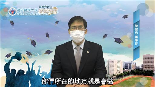 財團法人私立高雄醫學大學董事會陳建志董事長首先恭喜畢業生取得了開啟世界奧秘的知識之鑰,提醒大家踏出校園後才是挑戰的真正開始,要善用知識解決人迫切的問題,並要謹記「慎用所學」、「勇於應用所學」、「應用所學而能謙虛以對」,且別忘了年輕的本錢就是擁有想像與做夢的能力。期許大家保持著做夢的動力、築夢的勇氣,還有圓夢的毅力。不論大家落腳何處,所在的地方,就是高醫。