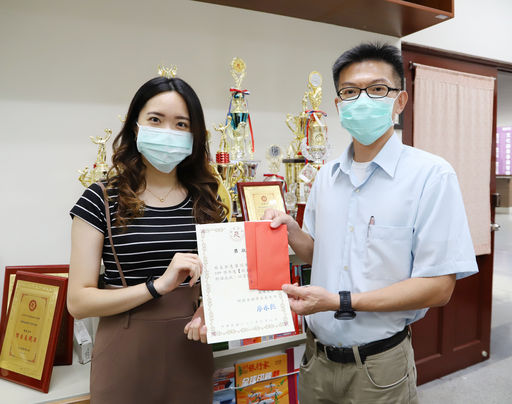 - 南華大學財金系證照王鄭惠馨(左)一年考取九張證照,廖永熙主任(右)頒發獎狀與獎金。