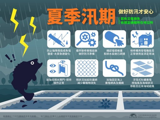 請養殖業者確實鞏固魚塭岸壁與疏通排水設施,並加強巡視水閘門、養殖備用水源,另請檢修備用發電機正常運作並添足用油;必要時請於塭堤加設防護網,及作好短時間強降雨造成魚塭鹽度、水質急速變化影響養殖物的因應措施。