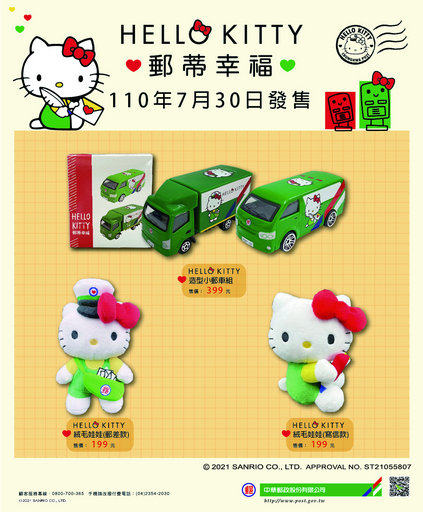 (中央社訊息服務20210729 14:48:47)中華郵政公司與國際知名三麗鷗經典明星HELLO KITTY合作,訂於110年7月30日續推出第3波「郵蒂幸福」聯名系列商品,以郵政經典元素結合化身超萌小郵差的HELLO KITTY,傳遞溫馨與祝福;另為慶祝中華郵政創辦125週年,亦同步發售金色車牌「HELLO KITTY造型小郵車組(限量紀念款)」888組,相關商品詳情如下: