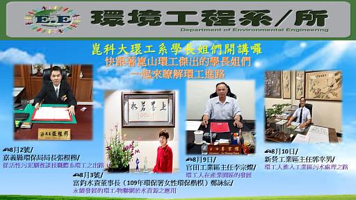 (中央社訊息服務20210809 14:11:50)崑山科技大學環境工程系培育環工專業人才逾30年,多位系友擔任政府或企業界要職,包括環保局局長、環保局主任秘書、環保局科長、工業區服務中心主任、自來水公司給水廠廠長、水資源回收中心廠長、污水處理廠廠長等高階主管,或是環保工程公司負責人。為迎接大學新鮮人的到來,環工系特別邀請系友們藉著暑假期間舉辦線上演講,讓新鮮人們更瞭解環工進路、系上所學、提早做好學習生涯規劃。