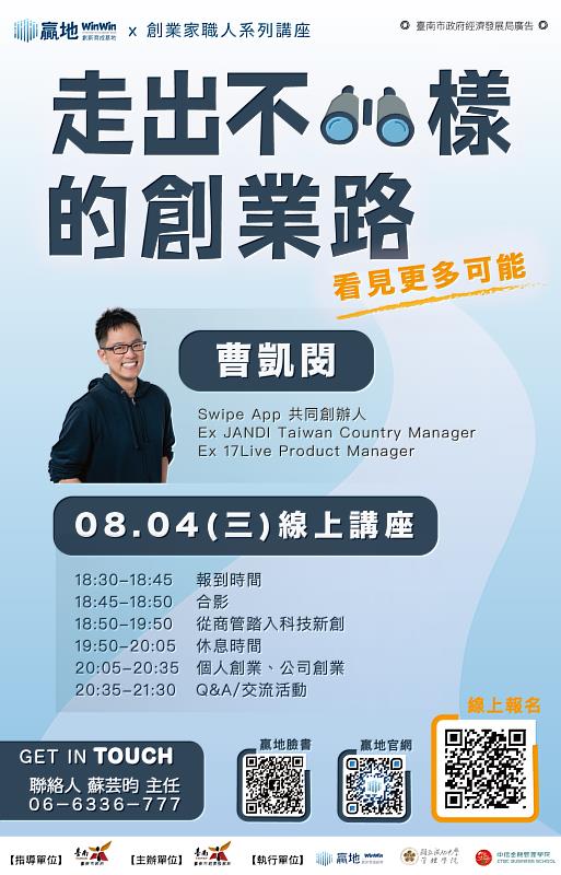 「看見趨勢、掌握機會」是創業家必備的能力。對於有志創業的新創人才,由臺南市政府經濟發展局指導的贏地創新育成基地提供創新育成服務,作為創業家的強力後盾,致力於推動創業生態系統、打造大臺南最完整的創業基地練功房。贏地創新育成基地除了提供空間租用、創業諮詢外,更提供一系列講座工作坊,培養創業思維或分享前輩經驗,詳情請至贏地創新育成基地粉絲專頁https://www.facebook.com/tainan.winwin/接收第一手資訊。