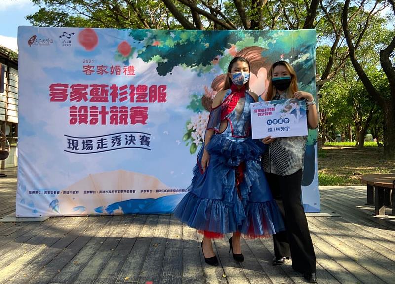 (中央社訊息服務20210817 11:01:45)高雄市政府客家事務委員會每年舉辦的客家婚禮是客庄12大節慶活動之一,今年已邁入第九年,往例皆委託專業服裝設計師製作禮服,今年改採競賽方式辦理「2021年客家婚禮~客家藍衫禮服設計競賽」,樹德科大流行設計系林芳宇同學的《蝶》作品,以及謝官妤與梁家瑋二人的《染宴》,2組作品在女裝組決賽獲得最高獎項的優勝,分獲獎金2萬元。