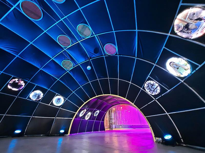 有料倉庫展區以三個聲影裝置主題,讓民眾感受離開都市生活,體驗宜蘭之美的不同意境。進入展區內,首先穿過一片煙霧瀰漫的環境,營造如同身處在都市叢林、烏煙瘴氣與擁擠的生活空間,離開了都市,走向以不同密度的白色絲帶打造出的《行雨宜蘭》,展現宜蘭雨的意象,穿越其中彷若走進雨裡,營造出別有風味的意境與心境;時光隧道《弦外之音》,隧道內保留純樸童真的宜蘭映像,隧道外為近代景象,透過光影與稻浪、海浪、孩子笑聲等在地聲音呼應,帶領觀者走進宜蘭過去到現在的流金歲月,而八米寬的《360度LED圓景劇院》,則是精采呈現在地山林記憶與百工技藝,讓民眾感受鄂王社區內老師傅的技藝與被宜蘭山海美景遼繞的視覺震撼感!整個展區從宜蘭雨的意象引導民眾進入雪隧後,再走進360度圓景中,感受宜蘭的寬闊與舒適。