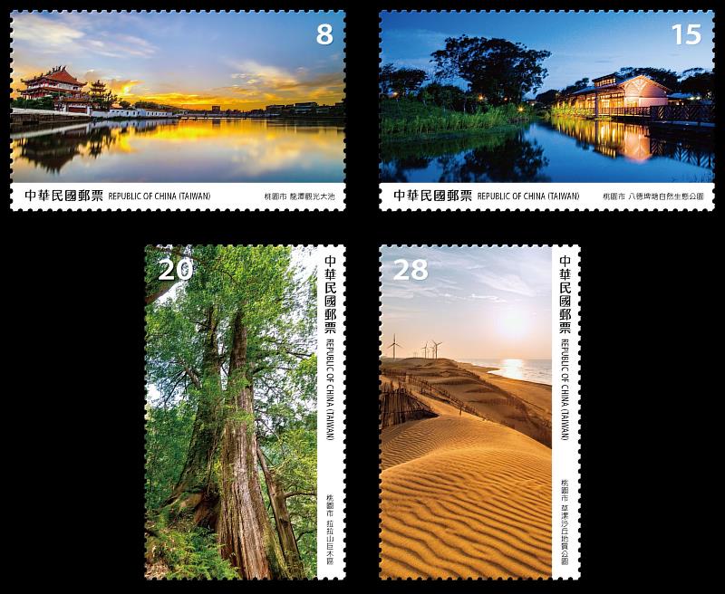 (中央社訊息服務20210907 14:25:17)臺灣旅遊資源豐富多元,中華郵政公司繼民國105年起發行「寶島風情」系列郵票後,續以龍潭觀光大池、八德埤塘自然生態公園、拉拉山巨木區及草漯沙丘地質公園等桃園市著名景點為題材,訂於110年9月10日發行「寶島風情郵票-桃園市」1套4枚,郵票面值分別為8元、15元、20元及28元。