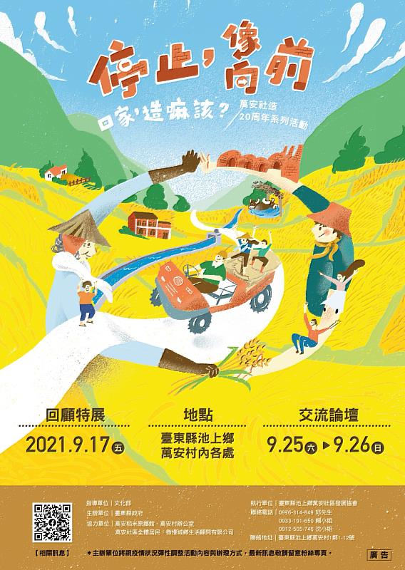 (中央社訊息服務20210907 15:44:27)「最好的向前,是先認識以前的每一步」。臺東池上萬安社區社造歷程已邁入第二十年,為了梳理過往展望未來,臺東縣政府與池上鄉萬安社區發展協會將於9月17日起在萬安社區、稻米原鄉館、活動中心等處舉辦「停止,像/向前:回家造嘛該?」20周年系列活動「回顧特展」,並於9月25至26日辦理「交流論壇」,邀請村民共襄盛舉,一起勾勒出下一個農村的遠見。