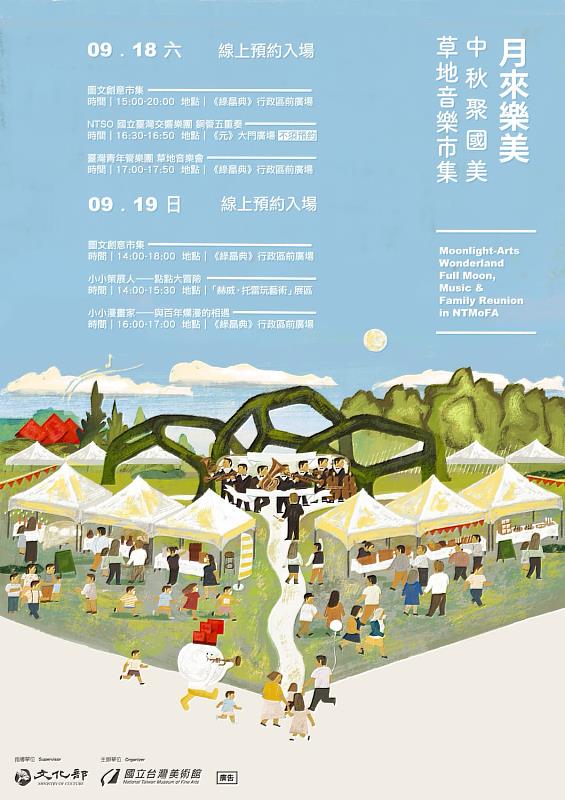 揭牌儀式後的「叩叩!歡迎光臨『藝』世界」啟動派對,由范特喜微創文化及廣受親子歡迎的「玩劇島」團隊設計規劃,將帶來遊戲趣味團康、互動戲劇表演,以及DIY活動啟用國美新空間。另外9月18日將舉辦「月來樂美—中秋聚國美草地音樂市集」,包含音樂會、圖文市集,以及為5-10歲孩童規劃的「小小策展人—點點大冒險」、「小小漫畫家—與『百年爛漫』的相遇」活動,邀請各界在疫情警戒解除後的第一個連續假期到國美館歡慶佳節,以藝文療癒疫情之下久未活動的你我。系列活動免費參加,因應防疫需求採線上報名,相關防疫措施請參見國美館官網 (https://www.ntmofa.gov.tw/)。