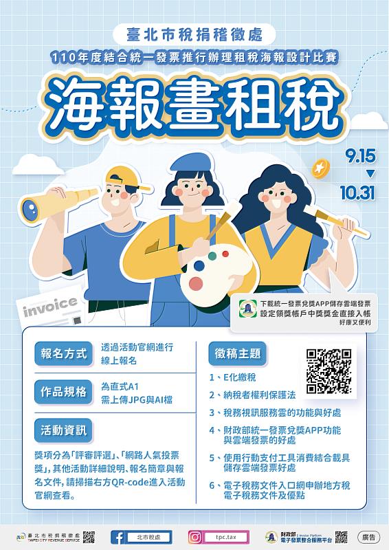(中央社訊息服務20210922 09:30:35)臺北市稅捐處以各項稅政為題,並藉由民眾靈活的創意,特別舉辦「海報畫租稅」租稅海報設計比賽,本次比賽主題包括統一發票兌獎APP的功能及雲端發票的好處、納稅者權利保護法等,主題素材之參考與作品規格相關規定已公告於該處活動官網。徵件日期自即日起至10月31日止,民眾只要以電腦繪圖的自創作品參賽,就有機會獲得評選大獎及網路人氣獎,總獎金高達16萬元,歡迎各方高手踴躍投件來比試。