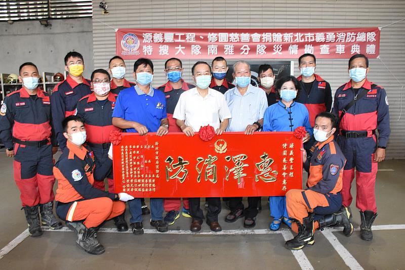 (中央社訊息服務20210927 09:40:50) 新北市土城區源義豐工程、修圓慈善會捐贈災情勘查車一輛予南雅義消分隊,消防局為表彰其好善樂施之無私精神,110年9月26日於消防局南雅分隊車庫舉辦捐車典禮。