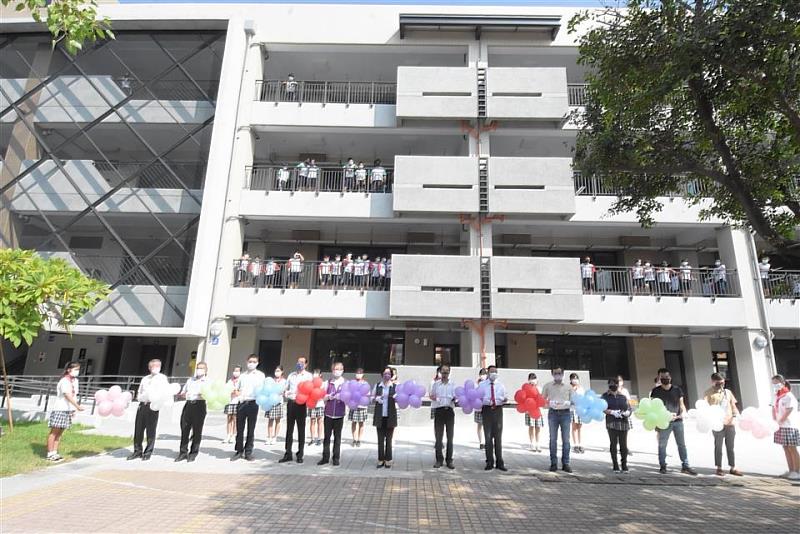 王縣長指出,兩棟校舍前後歷經4年多的改建,第一期「織光樓」在去(109)年10月完工,新建教室有12間,外型將地方特色呈現出來,包括織襪產業和灌溉滋養社頭農作的八堡圳、鴻門圳等。第二期「暮樂樓」在今(110)年5月完工,新建教室15間,把編織網牆融入「文化與創新」的建築美感,兩棟校舍完工後,縣府還補助更換智慧黑板、佈告欄等設備。