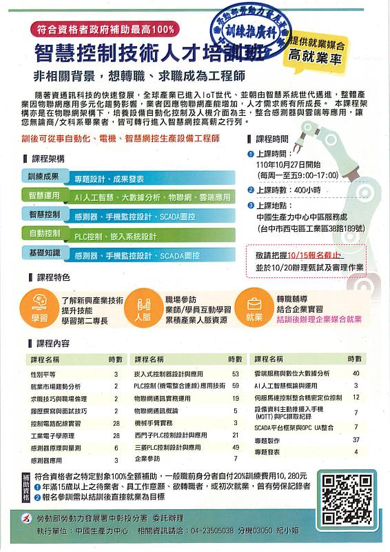 政府補助職前訓練「智慧控制技術人才培訓班」招生中