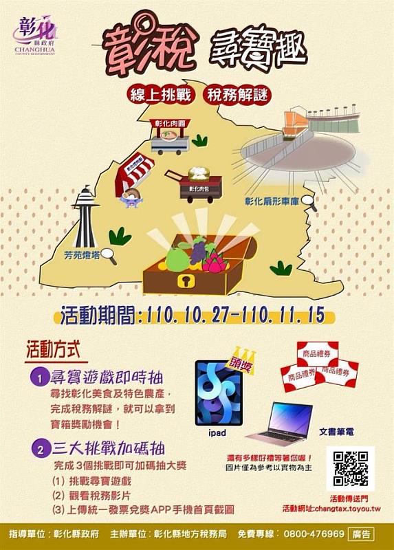 (中央社訊息服務20211025 18:10:13)彰化縣地方稅務局表示,為推廣政府最新稅政措施,於110年10月27日起至110年11月15日止,舉辦「彰稅尋寶趣」租稅宣導活動,歡迎民眾踴躍參加。
