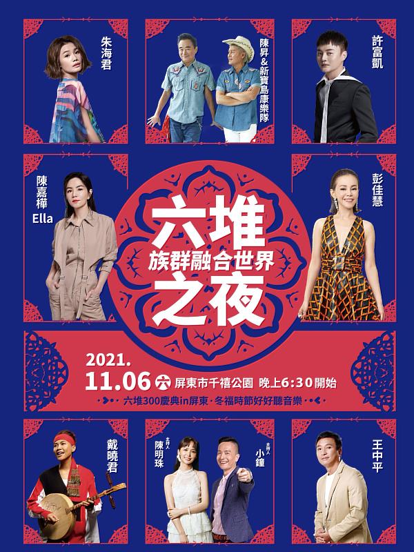 「族群融合世界六堆之夜」」邀請到來自前堆麟洛的屏東女兒Ella陳嘉樺與彭佳慧、與象徵多元音樂的陳昇新寶島康樂隊、右堆的金曲歌王許富凱、金曲歌后朱海君與同樣來自屏東的牡丹原住民歌后戴曉君、唱將王中平輪番上陣嗨翻六堆舞台。在活動當天晚間6點30分至9點30分,潘孟安縣長臉書亦將全程直播。